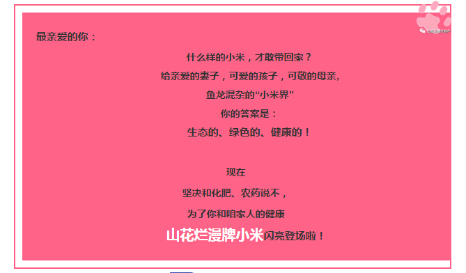 為了咱家人的健康,興縣山花爛漫牌小米只施天然有機(jī)肥,決不讓一?;蔬M(jìn)農(nóng)田,絕不使用殺蟲(chóng)劑、除草劑,人工種植、人工除草、人工收割,24小時(shí)追溯系統(tǒng)管理,粒粒小米精選,高品質(zhì)的保證!